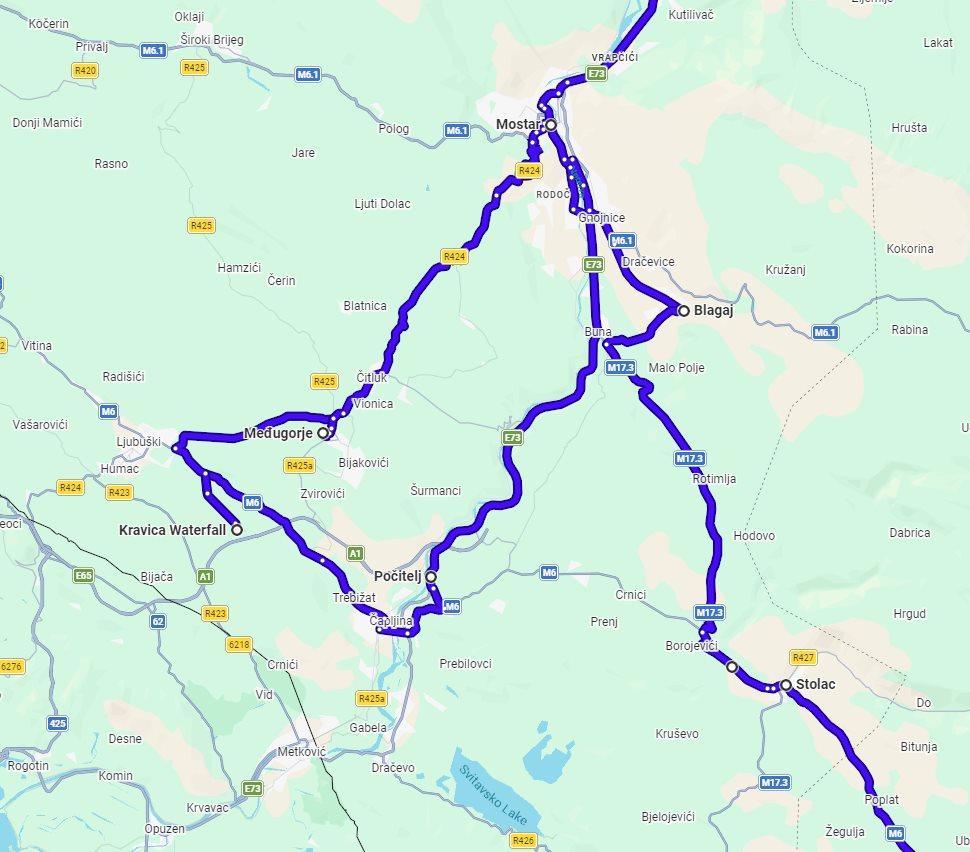 day 1: Tunnel of Hope museum, Travnik fortress, Travnik river; accommodation in Jajce Tour finishes in: Sarajevo, Bosnia and Herzegovina Planned distance of this tour: 811 km. #208 Tour maps detailedDue to the length and duration of this route, we were unable to put all the tour attractions on one map. Instead of one general map, here are a few detailed maps of this tour. Detailed map for part: Mostar area Availability of this tourPlease check below for the availability of this private tour for a specific month and year. In addition, for this tour, a 14 days cut-off period is in effect. Of course, you are always welcome to contact us with questions about availability. Check availability for specific period: