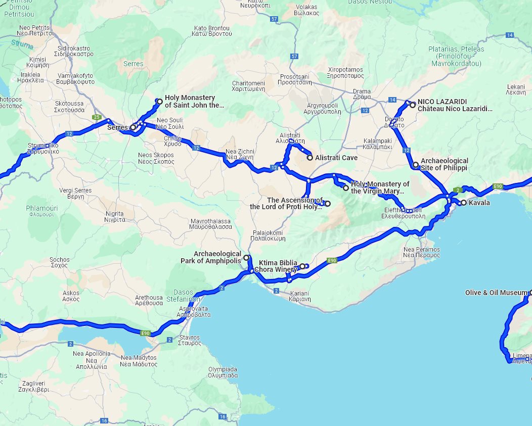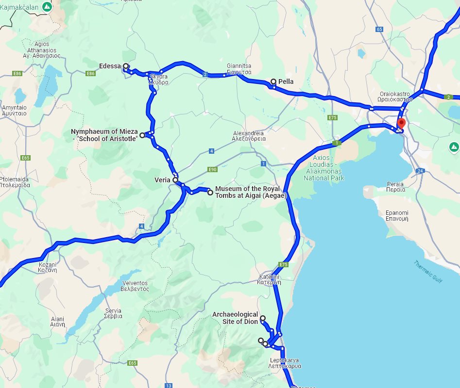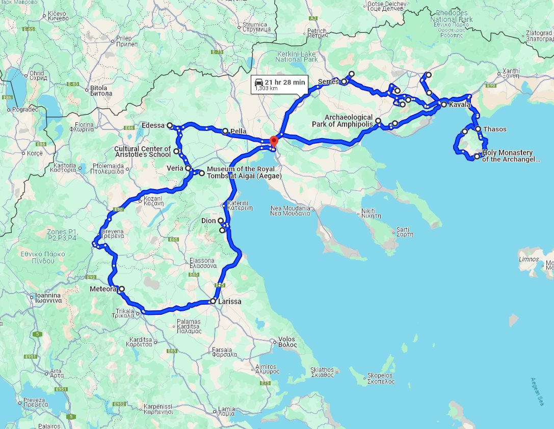 day 1: Amphipolis archaeological park, Amphipolis museum, Amphipolis archaeological site, Lion of Amphipolis historical landmark; accommodation in Kavala Tour finishes in: Thessaloniki, Greece Planned distance of this tour: 1303 km. #415 Tour maps detailedDue to the length and duration of this route, we were unable to put all the tour attractions on one map. Instead of one general map, here are a few detailed maps of this tour. Detailed map for part: Thasos island Detailed map for part: Greece, Macedonia Detailed map for part: Greece, Thessaly Availability of this tourPlease check below for the availability of this private tour for a specific month and year. In addition, for this tour, a 45 days cut-off period is in effect. Of course, you are always welcome to contact us with questions about availability. Check availability for specific period:
