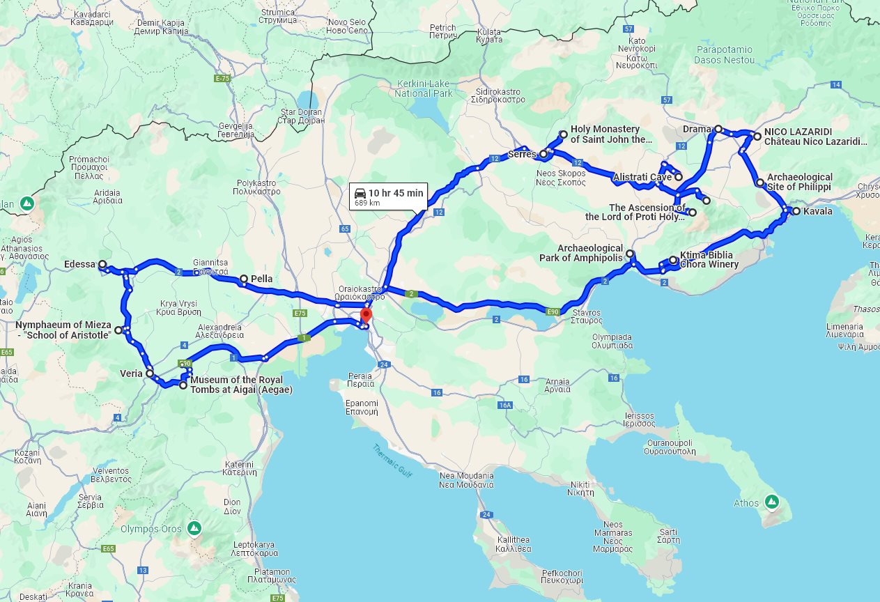 Tour summaryGreece Macedonia and Thessaly discovery 10 days tour from Thessaloniki. Car private tour by Monterrasol Travel. Circle trip via Amphipolis, Philippi, Kavala, Aegae, Pella, Edessa. This page describes details of the multi-day private car tour #417 offered by Monterrasol Travel. We, Monterrasol Travel, are an independent tour operator specialized in cultural and destination tourism. This sightseeing tour has been developed by Monterrasol Travel for private travelers based on our own experiences and belongs to the group of car tours with pre-designed itineraries. If you like this tour but you would like to change something, please do not hesitate to contact us and mention the ID number of this tour: #417. The custom itinerary will cost you nothing, it's free from our side. The tour will start and finish in Thessaloniki (Greece) and will take 10 days (9 nights). During this tour you will visit Amphipolis, Kavala, Philippi, Drama, Alistrati, Serres, Pella, Edessa, Mieza, Veria, Aigai located in Greece. Overall, with this tour you will visit 2 UNESCO World Heritage sites. Additional informationWe will pick you up at any hotel or place, in or around Thessaloniki. Drop off is the same as pick up, or upon request in another place. We, at Monterrasol Travel, practice the Slow Tourism philosophy. That means that we work our tours at a pace that allows to our clients have a more authentic experience and a true exploring of each destination that features in our itineraries. The default tour price includes rooms in 3-star hotels, which are usually not near historical centers with pedestrian streets. If you would like better accommodation in terms of location and quality level, please contact us. This tour can be booked by solo traveler as exclusive solo tour (the tour will be for you only, without other travelers in the vehicle). The price for 1 person reflects it. We provide for this tour a special discount for pensioners (seniors citizens). We recommend you consider traveling off-season. Advantages of traveling off-season. Photo galleryPhoto gallery of attractions involved in this tour. Tour descriptionCome with us to discover two famous regions of Greece, Macedonia and Thessaly, with our 10-day circle tour from Thessaloniki. With this off-season tour, we will see the most important attractions of both regions, together with a few lesser-known locations. The tour will start with discovering Amphipolis, an important ancient Greek polis and later a Roman city, nowadays a large archaeological site with a museum, known from antiquity as a colony of ancient Athenians and the site of the battle between the Spartans and Athenians in 422 BC. After Thessaloniki, we will come to Kavala to see its historical center and fortress. Near Kavala, we will come to explore the huge and important archaeological site of Philippi (UNESCO World Heritage site), with its exceptional Roman architecture, its urban layout as a smaller reflection of Rome itself, and its importance in Christianity because of several visits to the city by the apostle Paul. For those who enjoy wine, we will visit two famous wineries in the Kavala region, Biblia Chora winery and Chateau Nico Lazaridi winery, and taste their wines. After Philippi, we will see the beautiful Alistrati cave and two important monasteries, the Ascension of the Lord monastery and the Virgin Mary Eikosiphoinissa monastery. In Serres, we will see its historical attractions and visit one more monastery, the mountainous Saint John the Forerunner monastery. From Serres, we will come to Pella to see its archaeological site and museum. After walking in Pella, we will come to the town of Edessa to explore its attractions, small historical center, archaeological site, and the monastery of the Holy Trinity. From Edessa, we will visit the area of Mieza to see its archaeological site, ancient theater, and historical landmarks related to Aristotle. Our tour will continue with a visit to the Byzantine museum in Veria, and see the so-called Podium of Paul the Apostle, the site where he talked with people. Near Veria, we will come to Aegae (UNESCO World Heritage site), the first capital of the Macedonian kingdom and the burial place for their kings, considered to be one of the biggest and most significant places of classical Greece. Aegae is inscribed on the UNESCO World Heritage List because of its monumental significance in Western civilization and exceptional architecture. Border crossing for this tripThis tour does not require border crossing. Money and paymentsIn each country of your trip you can use main credit and debit cards. You can use ATM to withdrawal cash or pay at purchase point with card. More information on currencies, payments, and use cards you can read on this our page: On the trip: currencies, payments, card use. Last reviewed: 19 January 2026 Tour itineraryTour starts in: Thessaloniki, Greece day 1: travel to Amphipolis, visit Amphipolis archaeological park, visit Amphipolis museum, visit Amphipolis archaeological site, travel to Lion of Amphipolis to see Lion of Amphipolis historical landmark, travel to Biblia Chora to see Biblia Chora winery; travel to Kavala for accommodation Tour finishes in: Thessaloniki, Greece Planned distance of this tour: 688 km. What is a good itinerary for a multi-day tourHow to understand if this itinerary is good for you? Read our advice: what is a good itinerary for a multi-day tour. If you like this private tour and itinerary but you would like to change something, please do not hesitate to contact us and mention the ID number of this tour: #417. We do not charge for development a custom car tour itinerary, it will cost you nothing. We will be glad to discuss with you the details of your future trip and plan it following your ideas and wishes. Visited places during the tourOur tour will pass several towns and places along the route. Each town and place has something to offer from a tourist's point of view. We will stop in e
