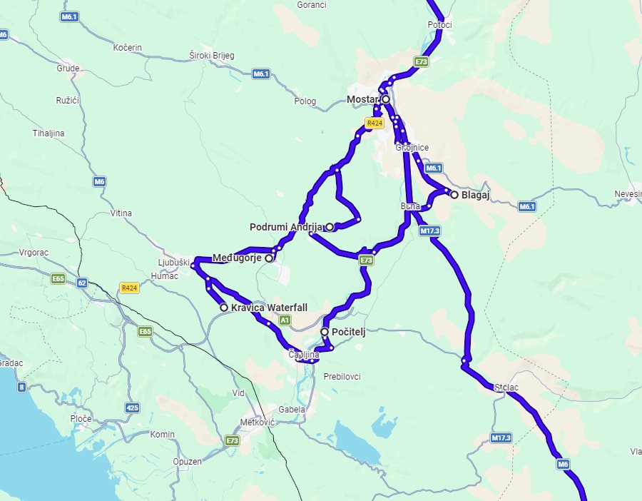 day 1: Sarajevo historical center, Sarajevo, Sacred Heart cathedral, Sarajevo, Gazi Husrev-beg museum, Sarajevo, Bascarsija old bazaar; accommodation in Sarajevo Tour finishes in: Sarajevo, Bosnia and Herzegovina Planned distance of this tour: 1227 km. #202 Tour maps detailedDue to the length and duration of this route, we were unable to put all the tour attractions on one map. Instead of one general map, here are a few detailed maps of this tour. Detailed map for part: Mostar area Availability of this tourPlease check below for the availability of this private tour for a specific month and year. In addition, for this tour, a 45 days cut-off period is in effect. Of course, you are always welcome to contact us with questions about availability. Check availability for specific period: