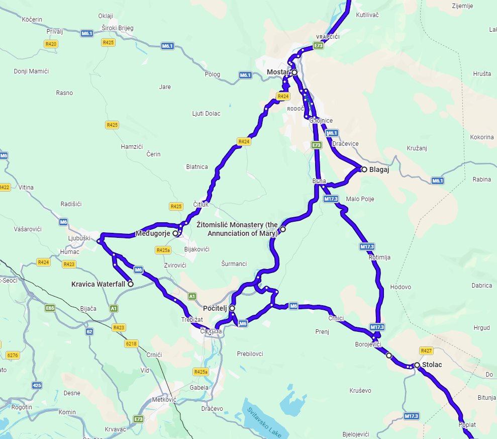 Tour summaryYear-round Bosnia discovery 5 days tour from Sarajevo. Private tour from Monterrasol Travel in minivan. Circle tour via Mostar, Blagaj, Pocitelj, Medjugorje, Kravica, Vjetrenica, Trebinje. This page describes details of the multi-day private car tour #402 offered by Monterrasol Travel. We, Monterrasol Travel, are an independent tour operator specialized in cultural and destination tourism. This sightseeing tour has been developed by Monterrasol Travel for private travelers based on our own experiences and belongs to the group of car tours with pre-designed itineraries. If you like this tour but you would like to change something, please do not hesitate to contact us and mention the ID number of this tour: #402. The custom itinerary will cost you nothing, it's free from our side. The tour will start and finish in Sarajevo (Bosnia and Herzegovina) and will take 5 days (4 nights). During this tour you will visit Tunnel of Hope, Konjic, Mostar, Blagaj, Radimlja, Počitelj, Žitomislić, Kravica, Međugorje, Stolac, Vjetrenica, Zavala, Trebinje, Tvrdoš, Sutjeska National Park located in Bosnia and Herzegovina. Overall, with this tour you will visit 3 UNESCO World Heritage sites and 3 sites from the UNESCO Tentative List (sites that were submitted to the World Heritage Committee, and are awaiting to consider for nomination, and therefore suitable for inscription on the World Heritage List). Additional informationWe will pick you up at any hotel or place, in or around Sarajevo. Drop off is the same as pick up, or upon request in another place. We, at Monterrasol Travel, practice the Slow Tourism philosophy. That means that we work our tours at a pace that allows to our clients have a more authentic experience and a true exploring of each destination that features in our itineraries. The default tour price includes rooms in 3-star hotels, which are usually not near historical centers with pedestrian streets. If you would like better accommodation in terms of location and quality level, please contact us. This tour can be booked by solo traveler as exclusive solo tour (the tour will be for you only, without other travelers in the vehicle). The price for 1 person reflects it. We provide for this tour a special discount for pensioners (seniors citizens). We recommend you consider traveling off-season. Advantages of traveling off-season. Photo galleryPhoto gallery of attractions involved in this tour. Tour descriptionIntroductionDiscover the profound beauty and rich heritage of Bosnia and Herzegovina on this comprehensive 5-day circle tour from Sarajevo. Designed as a year-round journey, this itinerary takes you through the heart of Herzegovina, exploring its most iconic UNESCO sites, spiritual landmarks, and breathtaking natural wonders. We will guide you on a captivating route that includes the legendary city of Mostar, the mystical Dervish monastery of Blagaj, the ancient hilltown of Pocitelj, the revered pilgrimage site of Medjugorje, the stunning Kravica waterfalls, and the subterranean marvels of Vjetrenica Cave. Experience the perfect harmony of history, faith, and landscape on this unforgettable exploration. Day after day descriptionDay 1. We depart Sarajevo and travel to the Tunnel of Hope Museum, a poignant testament to the city's siege in the 1990s. We then proceed to Konjic to see its iconic Old Stone Bridge, originally constructed in the 17th century. Our journey continues to Mostar to explore its famous historical center (UNESCO World Heritage Site) and the reconstructed 16th-century Stari Most (Old Bridge). Our accommodation for the night is in Mostar. Day 2. After staying in Mostar, we travel to Blagaj to visit the stunning Dervish monastery (Tekija) (UNESCO Tentative List Site), a 16th-century Sufi (Islamic) retreat. We then visit the remarkable medieval stecci (tombstone) necropolis at Radimlja (UNESCO World Heritage Site) from the 15th-16th centuries. We continue to the enchanting Ottoman-era hill town of Pocitelj (UNESCO Tentative List Site). After that, we will return to Mostar for accommodation. Day 3. After an overnight in Mostar, we travel to Zitomislic to visit its serene Serbian Orthodox monastery, originally founded in the 16th century. We then visit the magnificent Kravica waterfalls, a natural amphitheater of cascades on the Trebizat River. Our day continues to Medjugorje, a world-renowned Roman Catholic pilgrimage center since reported apparitions began in 1981. After that, we will return to Mostar for accommodation. Day 4. After 3 nights in Mostar, we travel to Stolac to explore its ancient hilltop fortress (UNESCO Tentative List Site) with origins from the 5th century. We then discover the fascinating Vjetrenica cave system (UNESCO World Heritage Site), renowned for its unique biodiversity and geological formations. We visit the nearby Zavala monastery, an Eastern Orthodox site with a historic church located in cave. Afterwards, we will come to Trebinje for accommodation. Day 5. After staying in Trebinje, we travel to Tvrdos to explore its Serbian Orthodox monastery, originally founded in the 15th century, and sample local wines at its winery. We return to Trebinje to see its iconic Arslanagica Bridge from the 16th century and explore its charming historical center. Our journey will continue with a scenic drive through the stunning landscapes of Sutjeska National Park before returning to Sarajevo. ConclusionThis 5-day discovery tour offers a deep and rewarding immersion into the cultural and natural treasures of Bosnia. We warmly invite you to join us for this memorable journey through a land of timeless beauty and enduring spirit. Border crossing for this tripThis tour does not require border crossing. Money and paymentsIn each country of your trip you can use main credit and debit cards. You can use ATM to withdrawal cash or pay at purchase point with card. More information on currencies, payments, and use cards you can read on this our page: On the tri